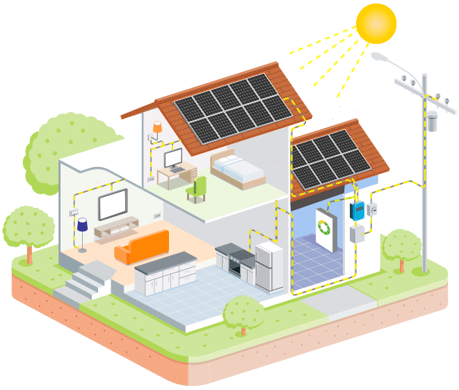 O funcionamento de sistemas de energia solar fotovoltaica utiliza painéis solares que captam a luz e geram, pelo efeito fotovoltaico, correntes elétricas contínuas, que são convertidas para correntes alternadas pelo inversor solar. Dessa forma, a eletricidade está pronta para ser distribuída no local, gerar créditos de energia ou ser armazenada.